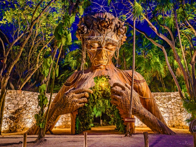 The Ven a la Luz sculpture is an impressive piece of art made from natural materials such as wood, ropes, and plants. It represents a giant human figure with its chest open, from which plants and roots emerge, symbolizing the connection between humans and nature. Its imposing size and unique design have made it a visual symbol of Tulum and sustainability in the Riviera Maya.